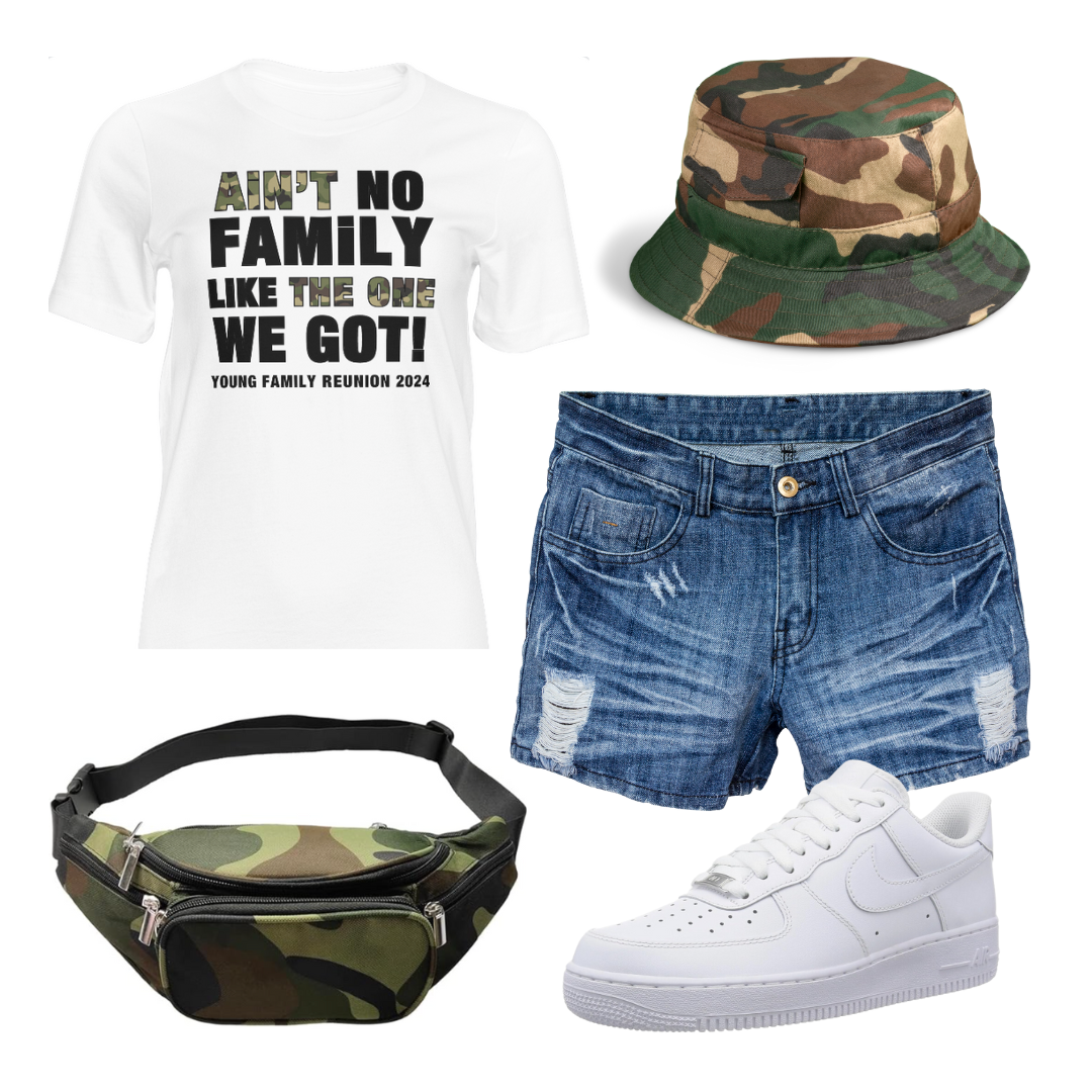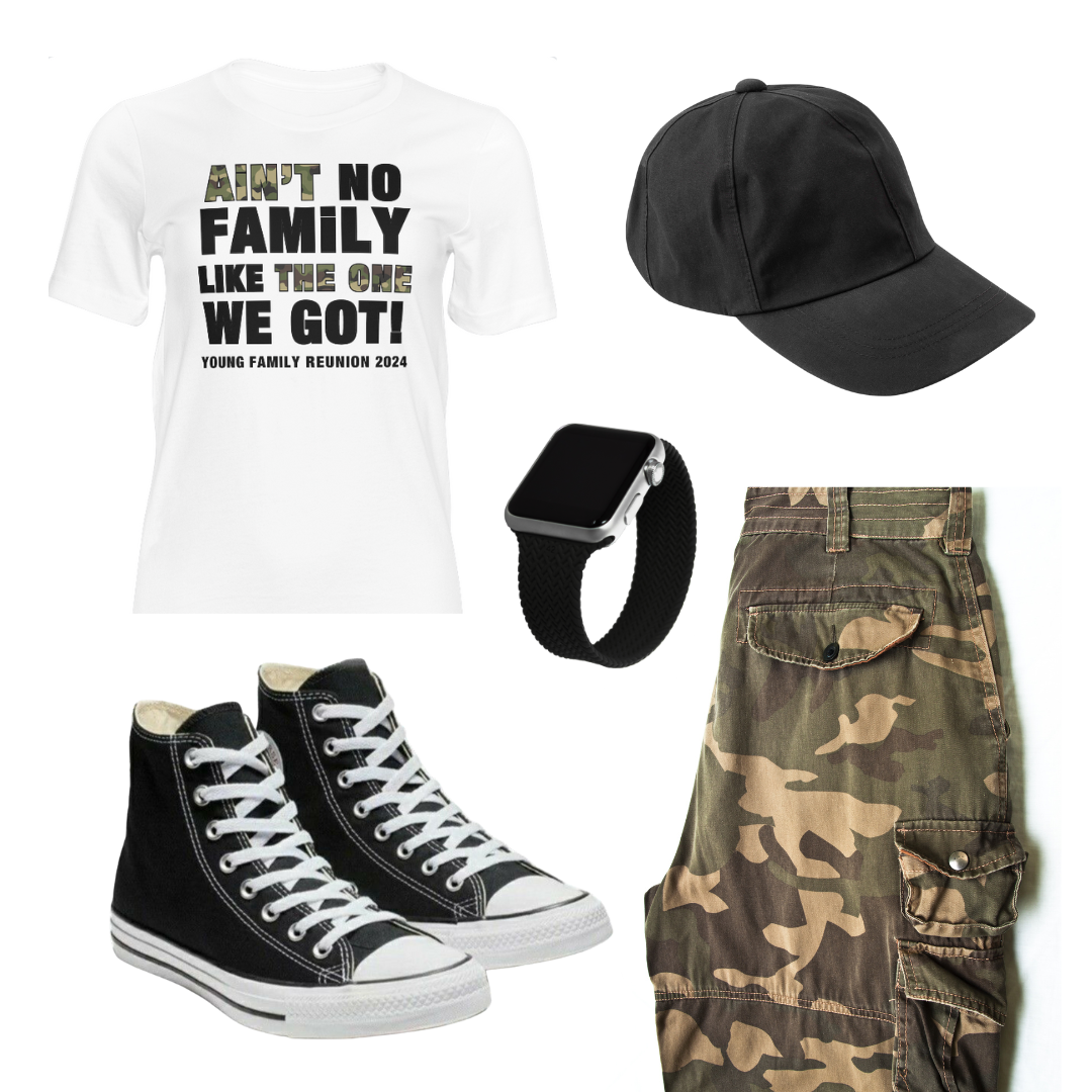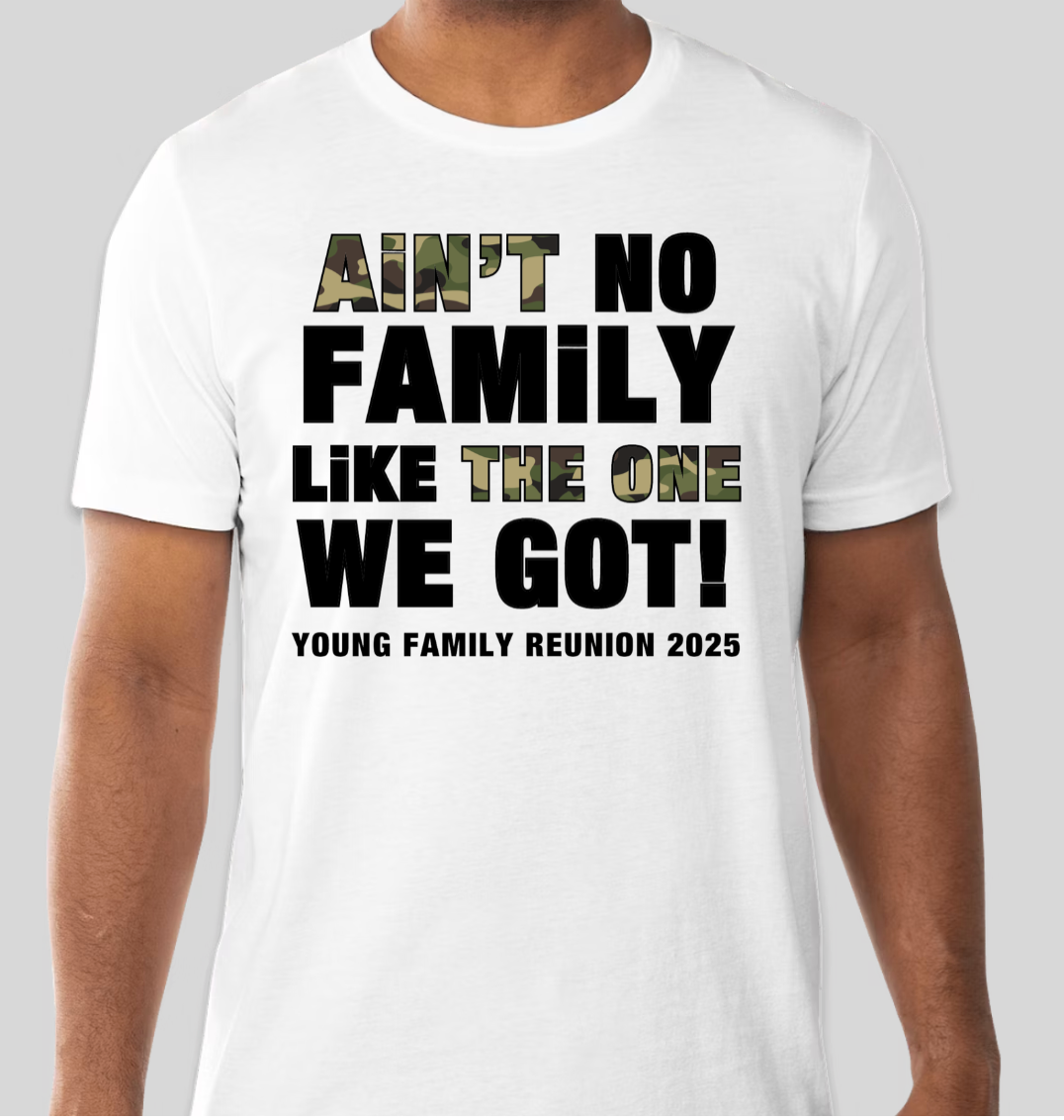 The main text is this year's reunion theme: "Ain't No Family Like the One We Got!" highlighting "Ain't the One" in camouflage print. Under the slogan reads the smaller text,"Young Family Reunion 2025".